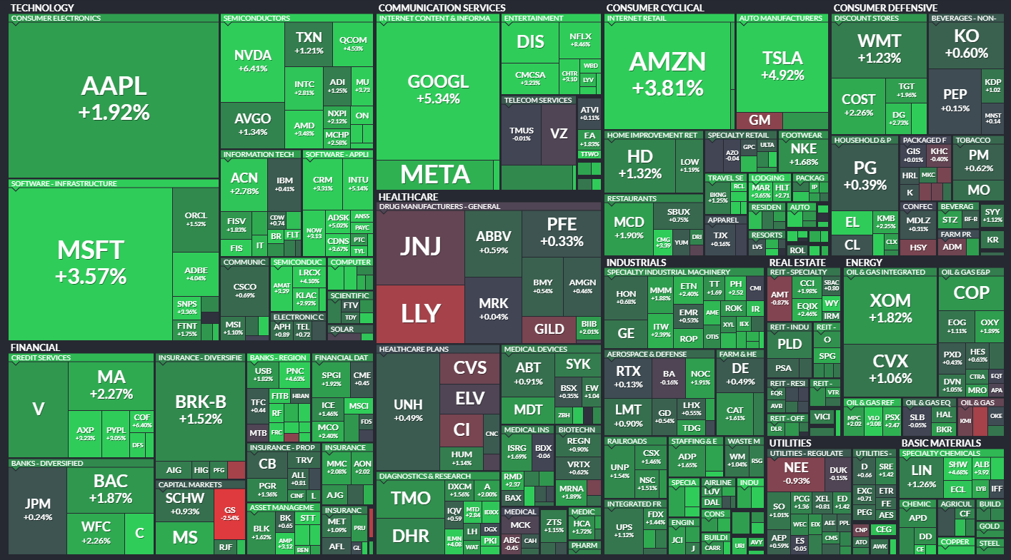 Every sector closed green. Communication services (+3.13%) led, and health care (+0.53%) lagged. 💚