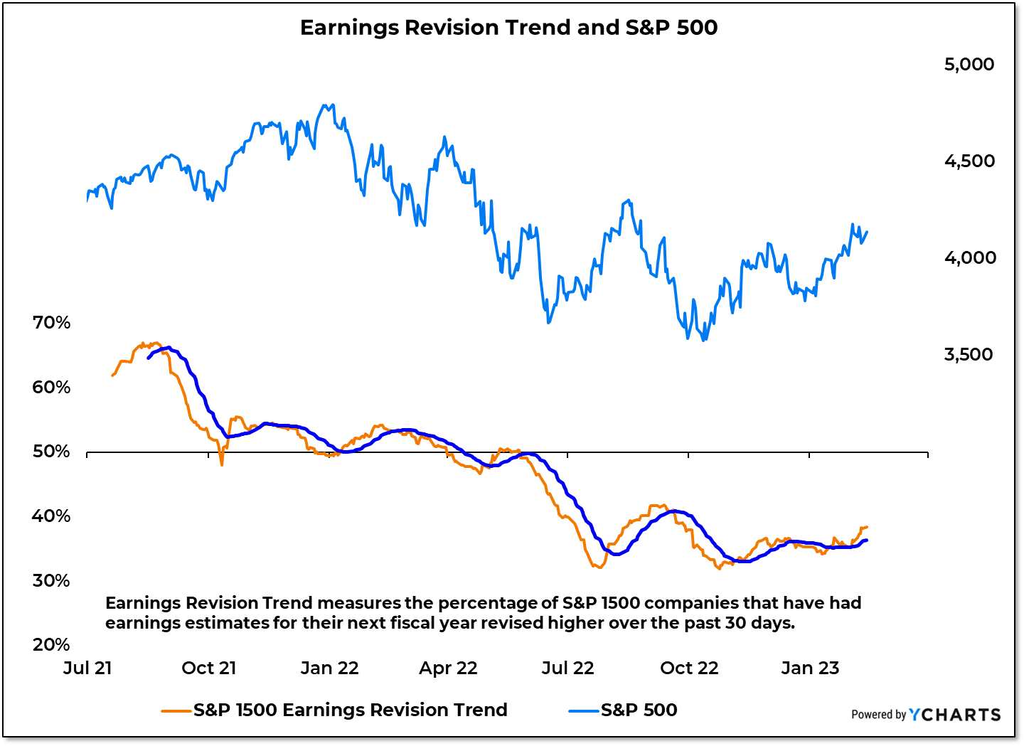 You can see the revisions trend rising as the price of the S&P500 keeps heading higher:
