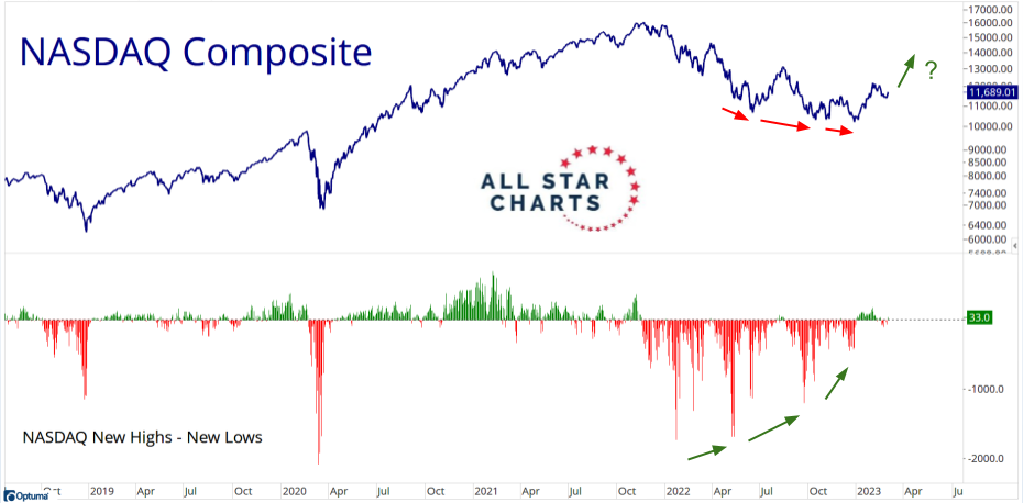 One chart that I thought told an important story last night was the Nasdaq Composite plotted with the New Highs - New Lows list.