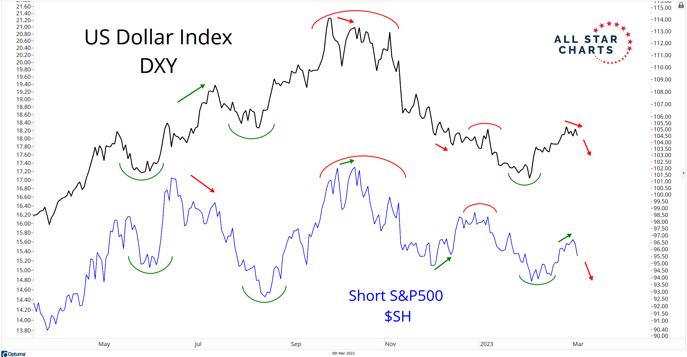 Look at the US Dollar Index overlaid with the short ETF for the S&P500.